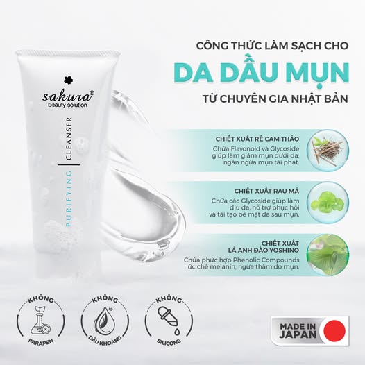 ✨ Sữa rửa mặt cho da dầu mụn Sakura Purifying Cleanser với chiết xuất lá trà xanh, cúc La Mã, rễ cây cam thảo, kháng viêm, kháng khuẩn, giúp da sạch sâu hơn, hạn chế tiết dầu và ngăn ngừa mụn hiệu quả. Đặc biệt sữa rửa mặt không gây khô da, căng da sau khi sử dụng, phù hợp với các loại da dầu, mụn và đang trong tình trạng nhạy cảm