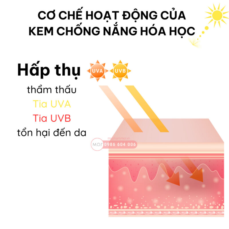 Kem chống nắng hoá học chống nắng theo cơ chế Hấp thụ các tia UV và phân tán chúng để không làm ảnh hưởng vào da