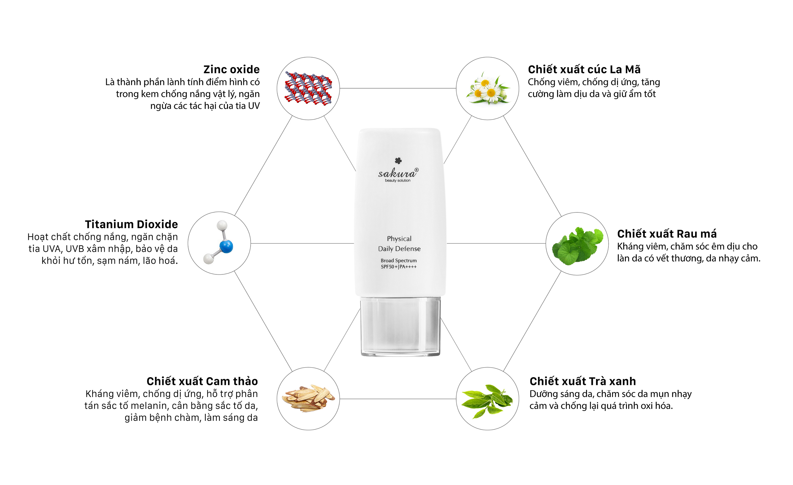Về bảng thành phần của nhũ tương chống nắng vật lý Nhật Sakura Physical Daily Defense có chứa ZinC Oxid và Titanium Dioxide, 2 thành phần chính trong dạng chống nắng vật lý. Đáng khen là ngoài công năng chính là chống nắng ra, hãng cũng rất chăm chút đến việc dưỡng da nữa khi mà thêm vào một số thành phần chiết xuất từ tự nhiên như trà xanh, cam thảo, cúc la mã, rau má. Các hoạt chất này sẽ giúp dưỡng da, giảm viêm, chống kích ứng, chống lão hóa cho làn da… Do đó, sản phẩm phù hợp với hầu hết loại da, đặc biệt là làn da nhạy cảm.