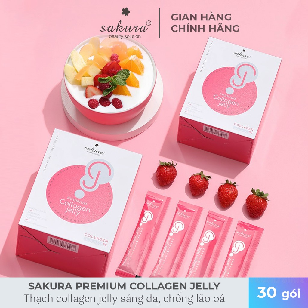 Thạch collagen Nhật Bản Sakura Collagen Jelly là sản phẩm mới nhất đến từ thương hiệu Sakura Beauty được nhập khẩu và phân phối chính thức bởi Sakura Beauty Vietnam. Mỗi thanh thạch có hàm lượng tối ưu 1000mg collagen 100% từ cá tuyết biển sâu, được thủy phân thành dạng peptide để tối ưu hóa hấp thu và phù hợp cơ địa Châu Á. Thạch collagen Nhật Sakura khác biệt với các sản phẩm collagen trên thị trường vì có chứa tinh chất nhau thai heo chuẩn SPF đậm đặc hơn gấp 50 lần các sản phẩm thông thường. SPF (Specific Pathogen Free) là một trong những chuẩn nhau thai cao cấp nhất của Nhật Bản. Ngoài ra thạch collagen Nhật Sakura còn khác biệt ở chiết xuất trái đào Nhật Bản cho mùi vị hoàn toàn tự nhiên, tốt cho sức khỏe.