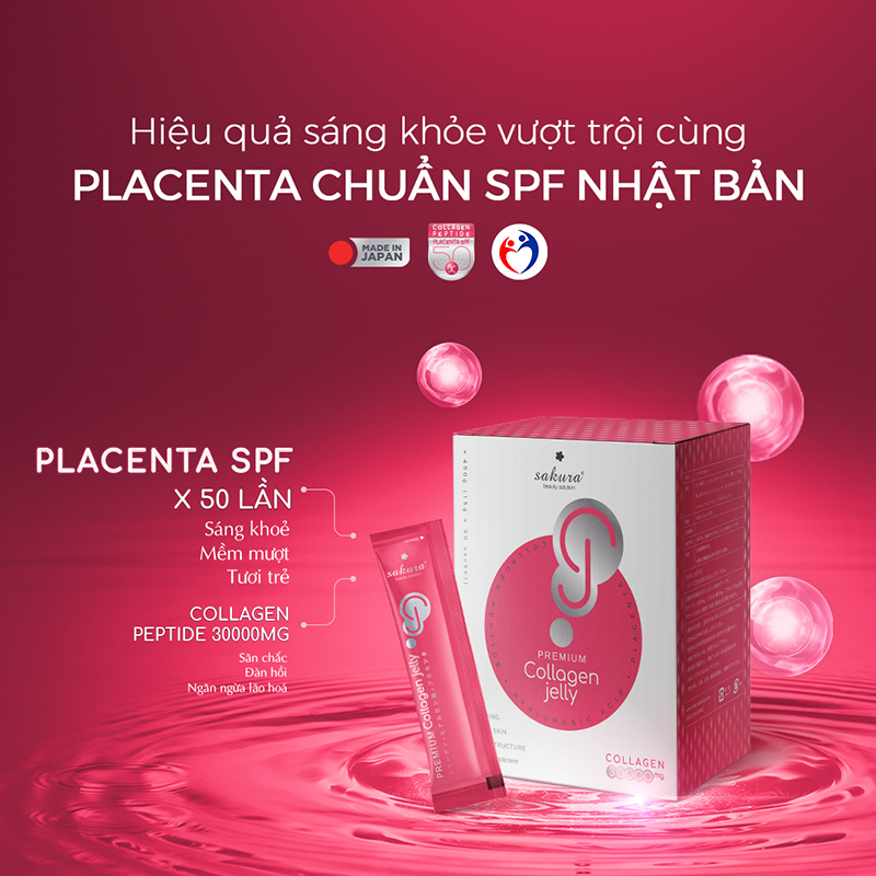 Mỗi thanh thạch có hàm lượng tối ưu 1000mg collagen 100% từ cá tuyết biển sâu, được thủy phân thành dạng peptide để tối ưu hóa hấp thu và phù hợp cơ địa Châu Á. Thạch collagen Nhật Bản - Sakura Premium Collgen Jelly khác biệt với các sản phẩm collagen trên thị trường vì có chứa tinh chất nhau thai heo chuẩn SPF đậm đặc hơn gấp 50 lần các sản phẩm thông thường. SPF (Specific Pathogen Free) là một trong những chuẩn nhau thai cao cấp nhất của Nhật Bản. Ngoài ra Sakura Premium Collagen Jelly còn khác biệt ở chiết xuất trái đào Nhật Bản cho mùi vị hoàn toàn tự nhiên, tốt cho sức khỏe.